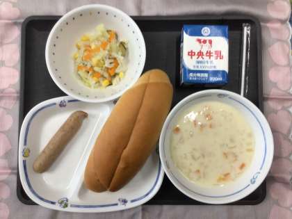 今日の献立は、ポタージュスープ、フレンチサラダ、ホットドッグ、サンドイッチロール、牛乳 でした。  エネルギー:775kcal