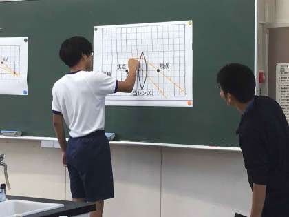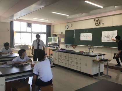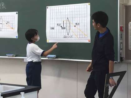 3・4組の授業は、じっくり考え、分かった!できた!を味わえるように進めています。理科の授業では、図をヒントにして考えたことを生徒自身が説明しながら理解を深めていました。