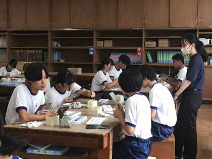 美術科の勉強をしている大学生が、学校体験活動として授業を参観しています。3年生は作品に立体感がでるように学んだことを生かしながら色を付けています。顔の特徴をよくとらえ、「似てる!」と感じる作品が多いです。