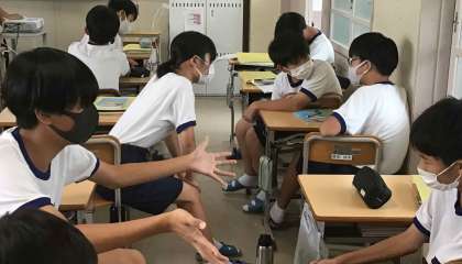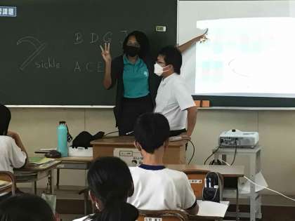 ALTのシャンティ先生と一緒に、学んだ英語を使って積極的にコミュニケーションをとっています。明日の稲刈りについてシャンティ先生に説明してみようと、ペアで練習したり全体で発表し合ったりしました。