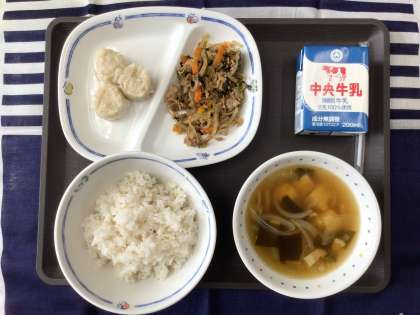 今日の献立は、わかめスープ、ビビンバ丼、エビ焼売、麦ごはん、牛乳 でした。 エネルギー:780kcal