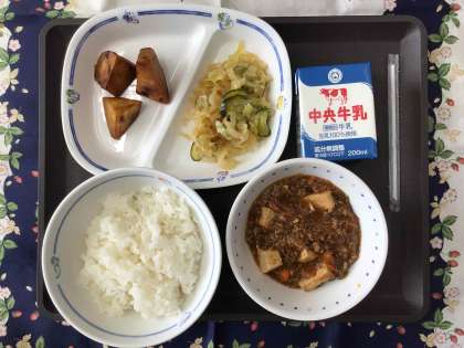 10/25 今日の給食 公開日 2023/10/25 更新日 2023/10/25 各学年から 今日の献立は、麻婆豆腐、拌三絲(バンサンスー)、大学いも、ごはん、牛乳 でした。 エネルギー:823kcal