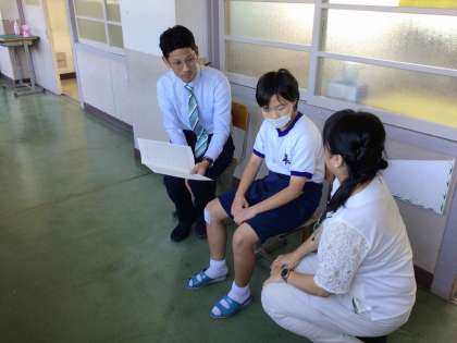 担任の先生たちから、通知表を受け取る生徒へ温かいアドバイスがありました。各自が、自分の通知表をしっかりと読んでいます。