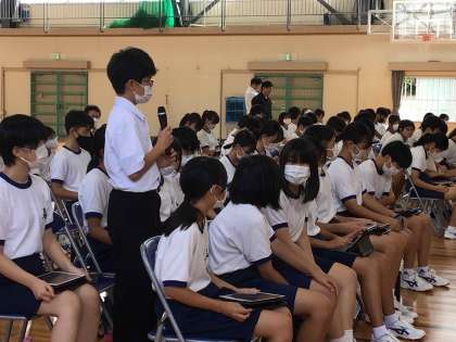 10月10日、後期が始まりました。生徒会意見交換会を実施し、生徒会役員、委員会委員長・副委員長が各活動の方針を示し、全校生徒で意見を交換しました。積極的に意見が出され、学校や生徒の生活がより良くなる活動が推進されると期待できました。