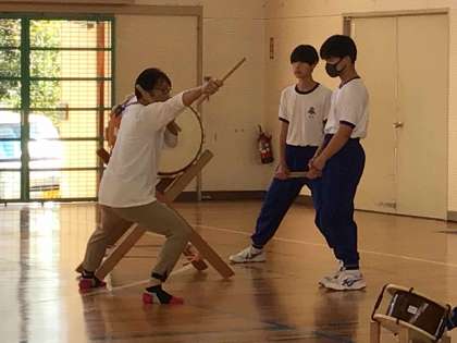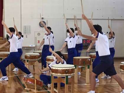 勘八太鼓グループは、朝の自主的な練習を志願するほど熱心に練習に取り組んでいます。講師の方のアドバイスに真剣に耳を傾け、音だけでなく姿でも魅せる演技を目指しています。