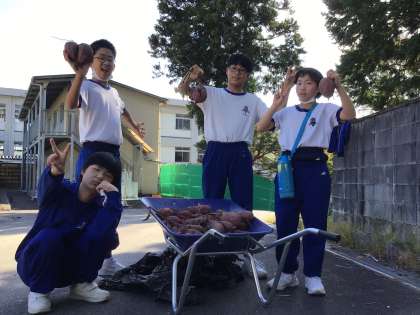 13日(金)に、3・4組の生徒全員で芋ほりをしました。酷暑続きもあってか、昨年度よりも少し収穫量が少なかったですが、立派に育ったサツマイモを収穫することができ、実りの秋を感じています。