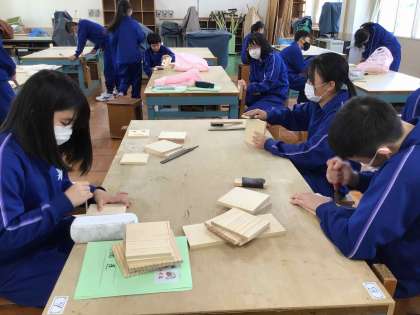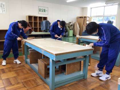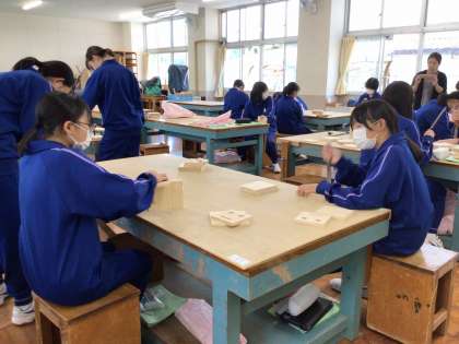 1年生の技術の授業では、全員がやすり等を使って木材を磨き上げていました。木工室に響くキューッキュッキュという音からも、必死に手を動かす様子が伝わってきました。