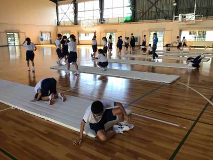 1年生の体育では、マット運動に取り組んでいます。前転、後転だけでなく、補助倒立にも挑戦しました。やや身体が固い人も見られます。