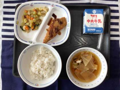 今日の献立は、たべまるのおすすめで、けんちん汁、もみじごはん、カレイフライ(ウスターソース) 麦ごはん、牛乳 でした。  エネルギー:792kcal