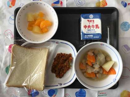 今日の献立は、ポトフ、ミックスフルーツ、スラッピージョー、スライスパン、牛乳 でした。  エネルギー:798kcal