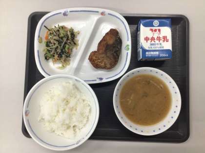 今日の献立は、きのこのみそ汁、のり酢あえ、サバの竜田揚げ、ごはん、牛乳 でした。  エネルギー:848kcal