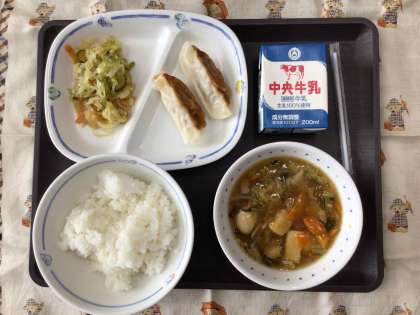 今日の献立は、八宝菜、拌三絲(バンサンスー)餃子、ごはん、牛乳 でした。  エネルギー:807kcal