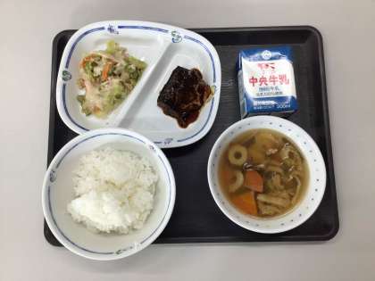 今日の献立は、のっぺい汁、和風サラダ(和風ドレッシング)サバのみそ煮、ごはん、牛乳 でした。  エネルギー:782kcal