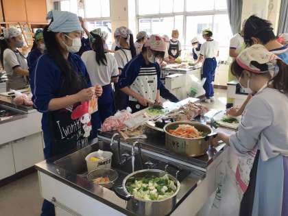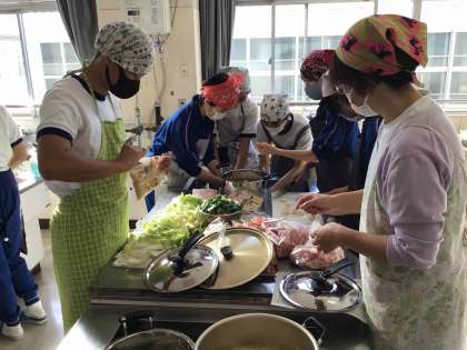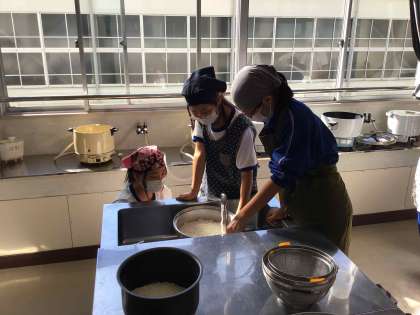 調理室では、収穫祭の準備を進めています。今年度収穫した石農米を研ぎ、豚汁作りをしています。PTAのみなさんにもお手伝いいただき、ありがたいです。