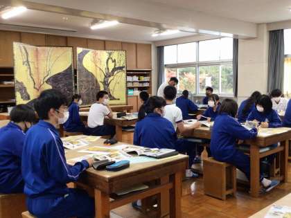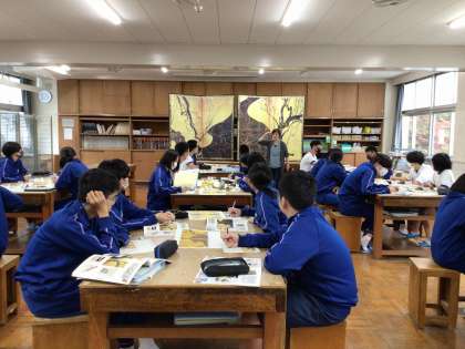 3年生の美術では、尾形光琳の紅白梅図屏風を鑑賞しました。実際の大きさや光の加減で印象が変わる屏風を見て気づいたことを聞き合いました。教科書とは違うスケールや立体感を味わうことができました。