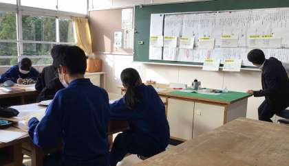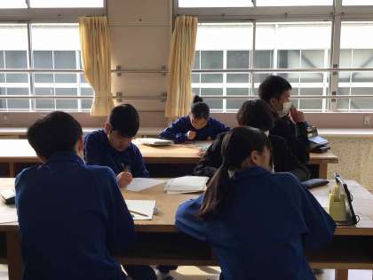 3年生の社会科では、生徒の質問にわかりやすく答えようと教科担任が朝の時間を使って特別解説講座を希望者向けに実施していました。参加していた生徒は、真剣なまなざしで解説を聞き、理解を深めていました。