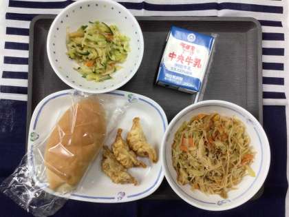 今日の献立は、炒めビーフン、中華サラダ、揚げ餃子、米粉パン、牛乳 でした。エネルギー:823kcal