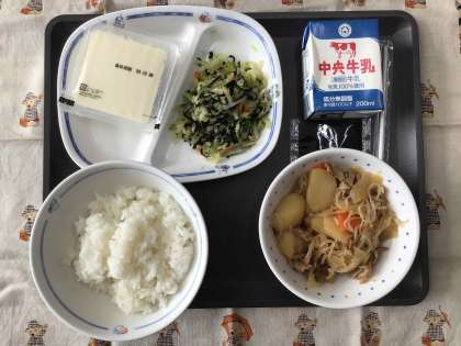 今日の献立は、肉じゃが、磯香あえ、湯豆腐・みそだれ、ごはん、牛乳 でした。エネルギー:830kcal