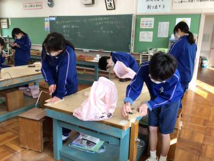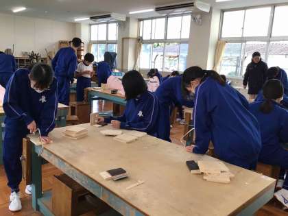1年生の技術では、木材を加工して作る「にこちゃんボックス」の制作が順調に進んでいます。工程に合った道具を使い、けがをしないように集中して活動しています。