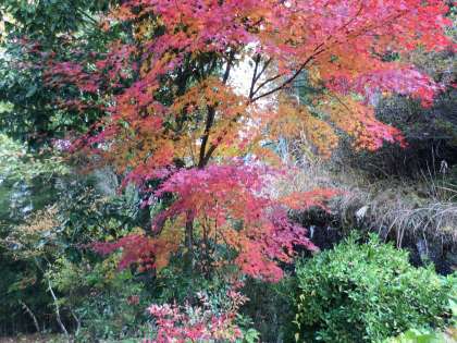 毎朝、大量の落ち葉や枯れ枝をボランティアの生徒と片付ける日々です。豊かな自然を愛でる心を忘れ、片付けることに意識が向いていたことを反省させられる美しい紅葉が、校内のいたるところで見られます。香嵐渓まで出かけなくても自然の彩を感じられる環境に感謝です。