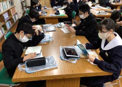 1年生の国語では、図書室で読みたい本を選び、読書をしました。読み進める中でわからない言葉があるとプリントに書き出し、学習用タブレットで意味を確認して読み進めていました。