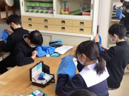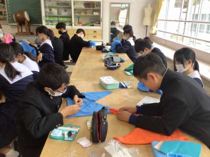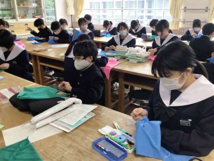 1年生の家庭科では、あずま袋を製作しています。練習した手縫いの技術を使って、一針ずつ丁寧に縫い進めていました。