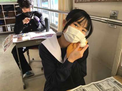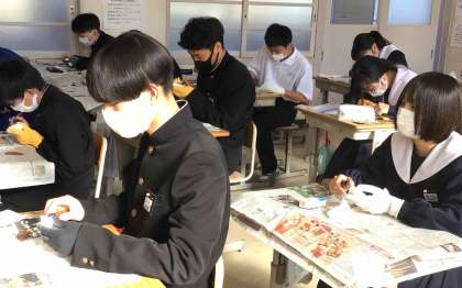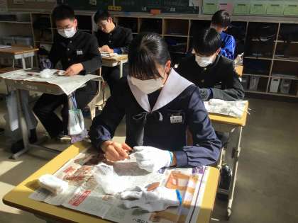 3年生の技術は、固形石鹸を削って、思い思いの形を作っています。「何に見える?」「こうしたらいいんじゃない?」と級友と声を掛け合いながら、けがをしないように気を付けて制作しています。