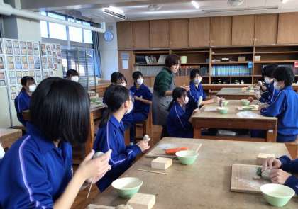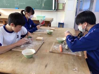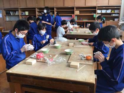 1年生の美術では、野菜の塑像制作を始めました。粘土を使い、本物をじっくり見つめながら形作りをしました。表現に必要な道具を使い分け、工夫しながら取り組んでいました。