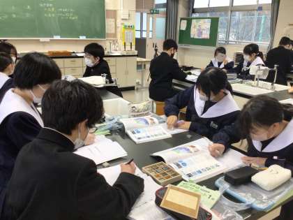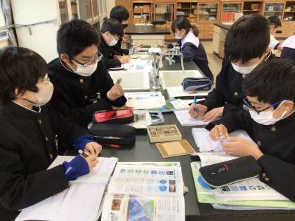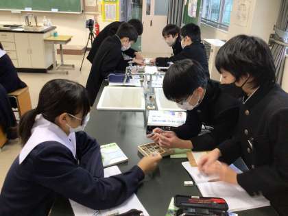 1年生理科では、岩石の学習をしています。火山岩、深成岩を手に取り、特徴を観察してノートに記録しました。違いを比較することで、岩石のでき方の違いを理解できるようにしています。