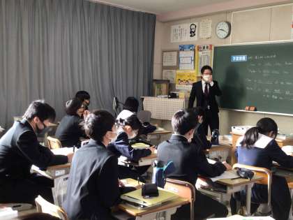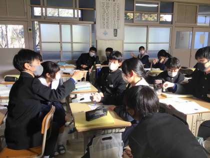 2年生の英語では、比較、最上級の表現を学んでいます。教科担任と身長を比べるなど、身近な話題から楽しく英語表現を学んでいました。
