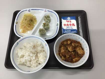 今日の献立は、麻婆豆腐、華風あえ、野菜入り焼売、麦ごはん、牛乳 でした。エネルギー:794kcal