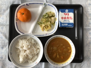 今日の献立は、カレーライス、イカサラダ、みかん(生)、麦ごはん、牛乳 でした。エネルギー:884kcal