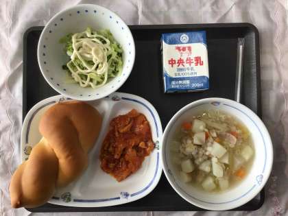 今日の献立は、大麦と野菜のスープ、ブロッコリーサラダ(マヨネーズ風ドレッシング)、鶏肉のトマト煮込み、ツイストパン、牛乳 でした。エネルギー:815kcal