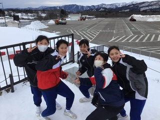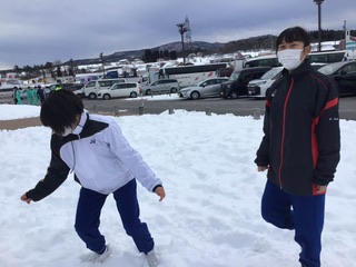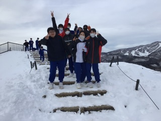 ひるがの高原サービスエリアで、生徒たちは積もった雪を嬉しそうに眺め、素手で触っていました。寒いですが、生徒の笑顔は輝いています。