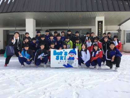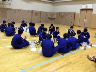 生徒は体育館で持参した昼食をおいしそうに食べています。