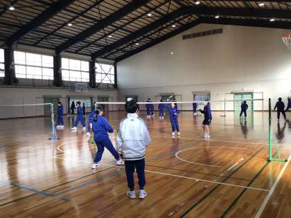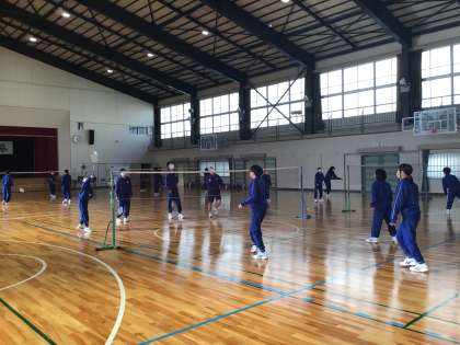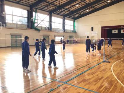 1年生の体育は、バドミントンを男女のペアになり、お互いに声を掛け合って行っています。