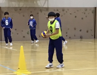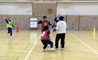 クイズドッジボールを楽しんでいます。クイズに正解すると外野が1人戻れるというルールです。