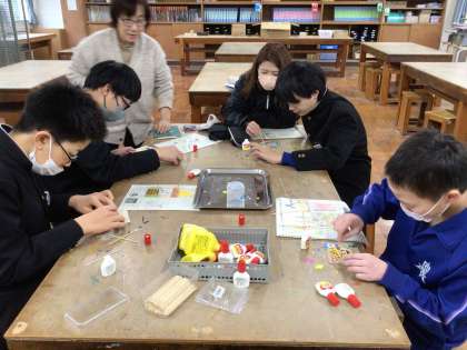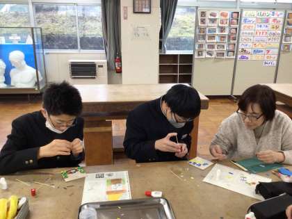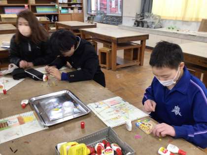 3・4組の美術では、集中して細かい作業を進めています。竹串を使ってボンドを塗り、隙間ができないように色板を貼りました。カラフルな作品の完成が楽しみです。