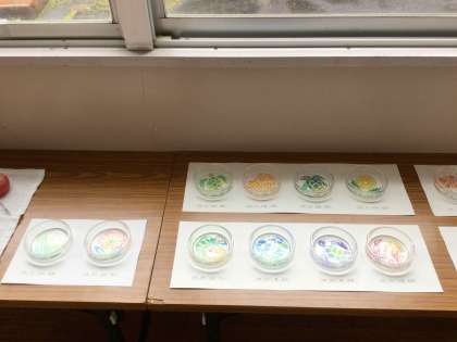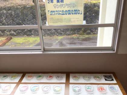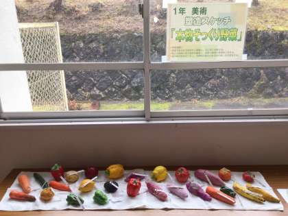 美術で制作した作品 1年生「塑像スケッチ 本物そっくり野菜」2年生「サンドブラスト ガラスに生き物を刻む」です。力作がそろっています。