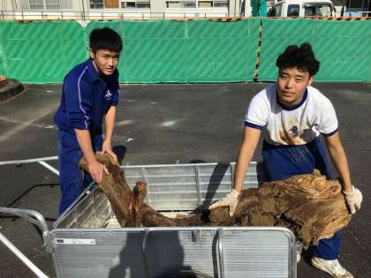 公務手さんの要望を受け、駐輪場前の切り株を掘り起こしてくれた3年生。泥だらけになりながら、力を合わせて抜いてくれました。こんなに大きいとは・・・「大きなかぶ」ならぬ「大きな切り株」が抜けました。