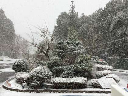 夜明けとともに降り出した雪が、うっすらと積もっています。生徒が登校する時間帯に雪の勢いが増したので心配しましたが、自転車通学の生徒もけがをすることなく登校できたようです。手袋もはめずに雪をさわり、手を真っ赤にしている生徒もいました。子どもは、雪にもまけず、元気です。