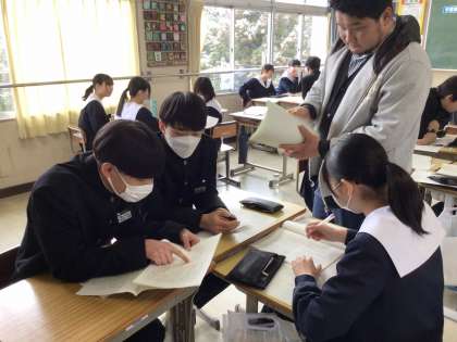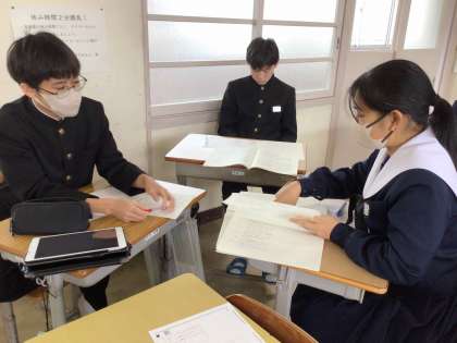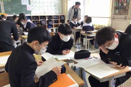 3年生の国語科では、テスト対策問題でよく分からなかったことを教えあって理解を深めていました。人に教えることで理解が確かなものになると言われます。受験は団体戦。頑張れ3年生!