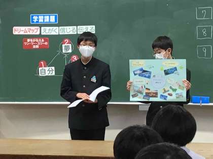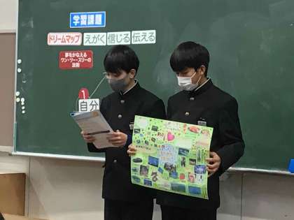 2年生は、完成したドリームマップを全員発表しました。1日の授業を通して、自分の将来について深く考えることができてよかった等の感想を書く生徒が多くいました。