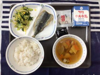 今日の献立は、「節分献立」で、かしわ汁、なばなのおひたし、イワシのかば焼き丼(かば焼きのたれ)、節分豆 麦ごはん、牛乳 でした。エネルギー:788kcal