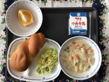 2/8 今日の給食 公開日 2024/02/08 更新日 2024/02/08 各学年から 今日の献立は、マカロニのクリーム煮、コーンサラダ、いよかん(生)、ツイストパン、牛乳 でした。エネルギー:825kcal