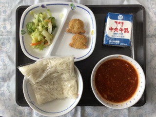 今日の献立は、トマトソースかけ、フレンチサラダ、タコナゲット、ソフト麺、牛乳 でした。エネルギー:810kcal