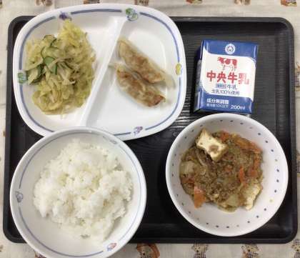 今日の献立は、ピリッと厚揚げ、華風あえ、餃子、ごはん、牛乳 でした。エネルギー:805kcal