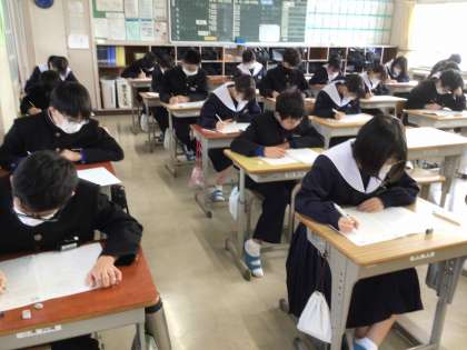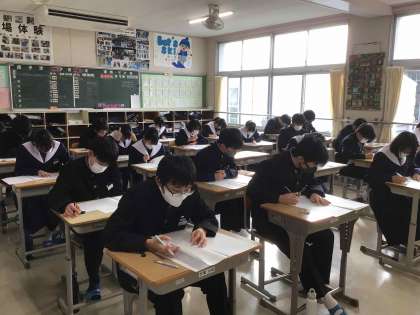 1年生は英語から、2年生は国語から学習診断テストを受けています。真剣に問題を読み、答案用紙に向かっています。今までの学習の成果が発揮できますように。