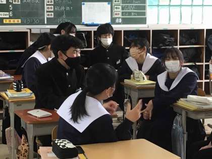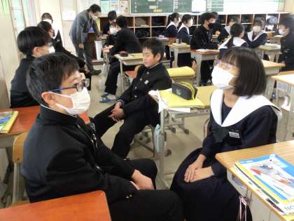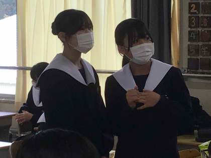 昨日の夜に食べたものを、英語で紹介し合っていました。学んだ英単語を組み合わせて表現したり、身振り手振りを交えて笑顔で聞き合っています。