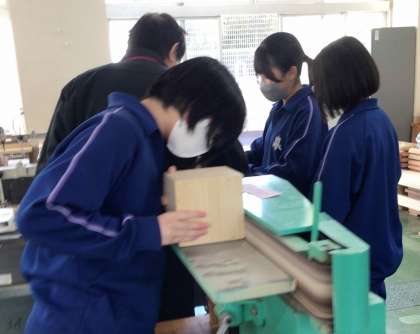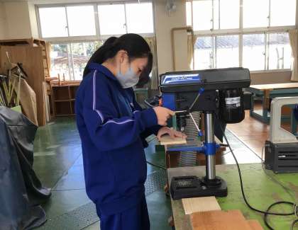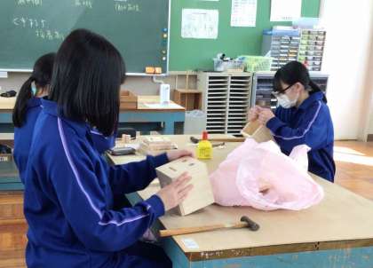1年生の技術では、かんな等の道具を使って板の角を落とす「面取り」や「釘打ち」を進めました。作品の完成が近づいてきています。